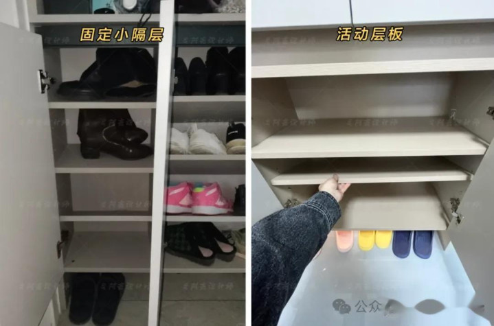 固定小隔层的鞋柜,放不了高帮鞋、长靴,只能把鞋子挤在一起,拿取时还会碰倒其他鞋。我家之前的固定隔层,长靴只能斜着放,占空间还容易变形。