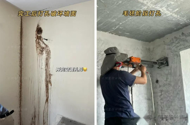 要毛坯时打孔:水电改造后、贴砖刷漆前,把需要打孔的位置(空调冷凝水孔、燃气热水器排烟孔)都标好,让师傅用专业工具打孔。提前留好孔,后期安装直接用,不会破坏装修。