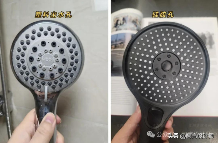 要硅胶出水孔:选全硅胶出水孔的花洒,水垢堵了用手一捏就通,根本不用工具。顶喷和手持都要选硅胶款,每次洗澡后捏一捏,水流永远顺畅,用 5 年都不用换花洒头。