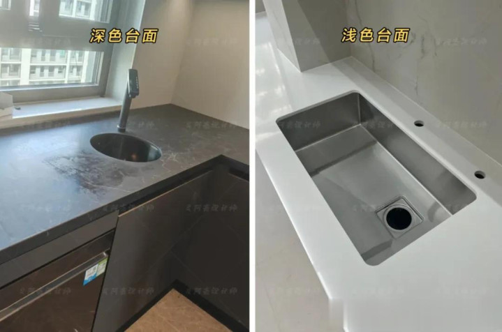 深色台面(比如黑色、深灰)看着高级,用一周就现原形 —— 水渍、手印、面粉痕迹特别明显,每天得擦 3 遍才干净,尤其做饭频繁的家庭,台面永远像没收拾。
